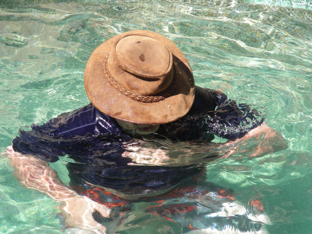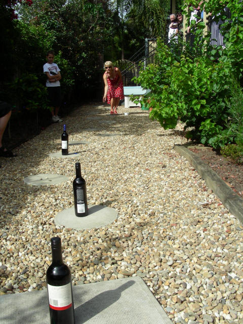 spelletjes doen. Hier met een dollar zo dicht mogelijk bij de fles gooien. Wie dichtste bij is wint de wijn.
